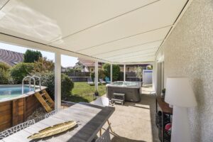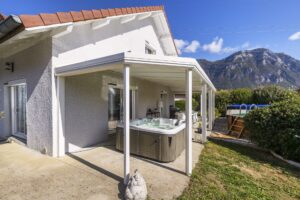 Le couple voulait également un abri au-dessus du jacuzzi et du salon de jardin. Finalement, nos clients ont choisi d’installer une véranda Luciole® sans les vitrages en tant que patio. La toiture pleine permet de protéger les aménagements en hiver. Il s’agit d’une solution commune dans la région. En effet, contrairement aux pergolas, la toiture parfaitement étanche de la véranda protège contre la neige particulièrement présente en Savoie. Cette solution s’adapte également aux projets futurs du couple qui a comme idée de rajouter les vitrages d’ici quelques années pour créer une réelle pièce à vivre.